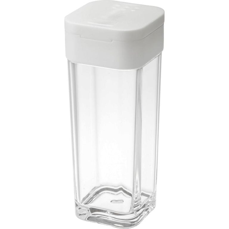 使いたい量が片手で調節できる調味料保存容器。前後にフタをスライドさせ、分量を選んで出すことができます。四角い形状で引き出しなどに無駄なくすっきり収納できます。